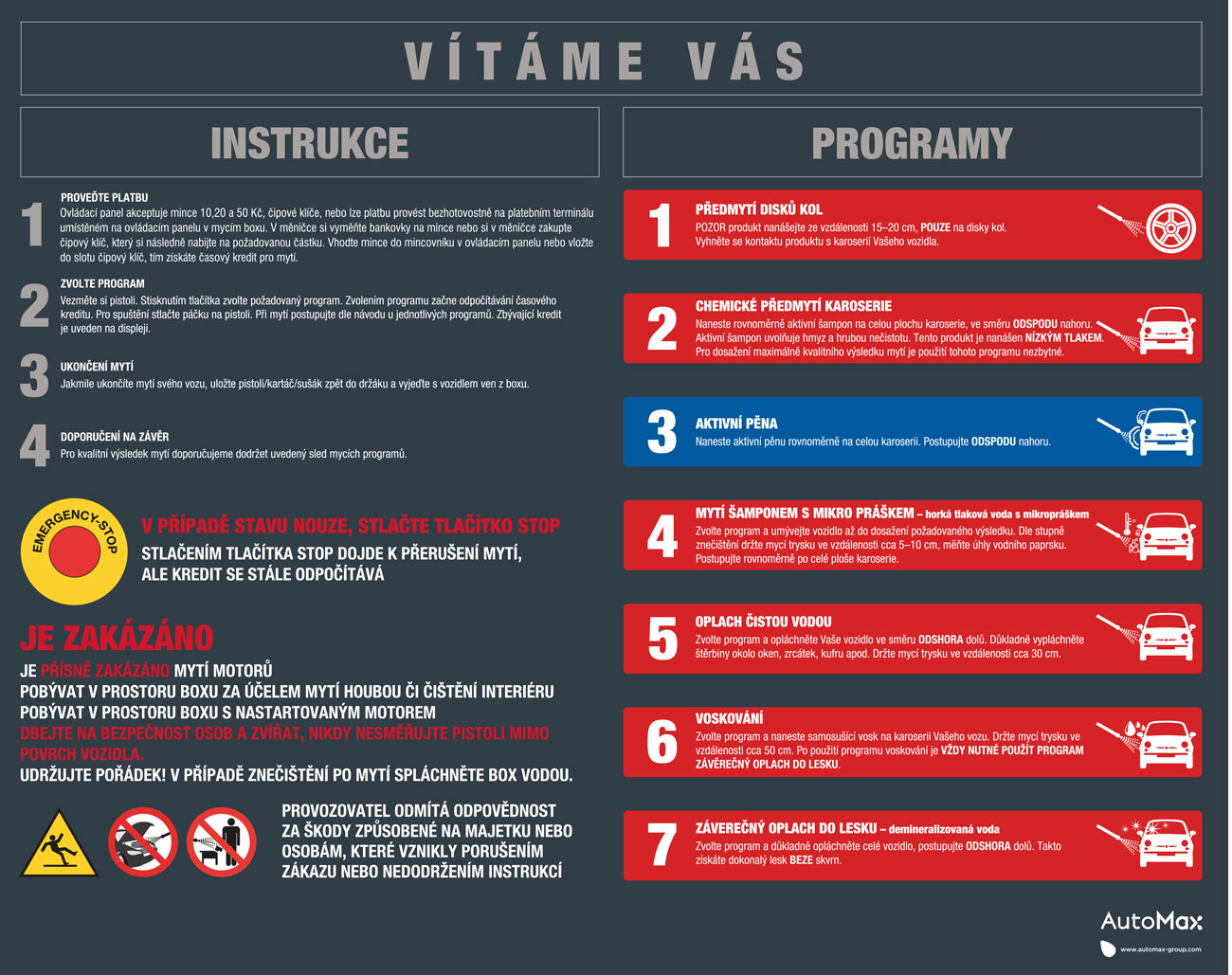 PROGRAMY: chemické předmytí karosérie a disků, mytí podvozku, aktivní pěna, mytí kartáčem, mytí mikropráškem a teplou vodou, oplach, voskování a závěrečný oplach osmotickou vodou.